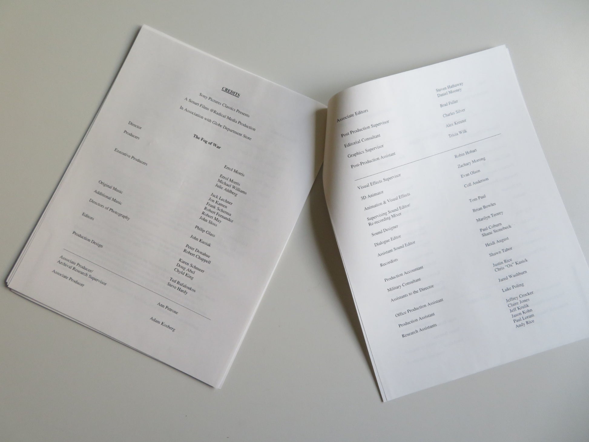 • Production notes and credits, 8 pages, 11" x 8.5" = scuffing more damage than would be expected in specific areas, staples in the notes, these notes are in good condition.
