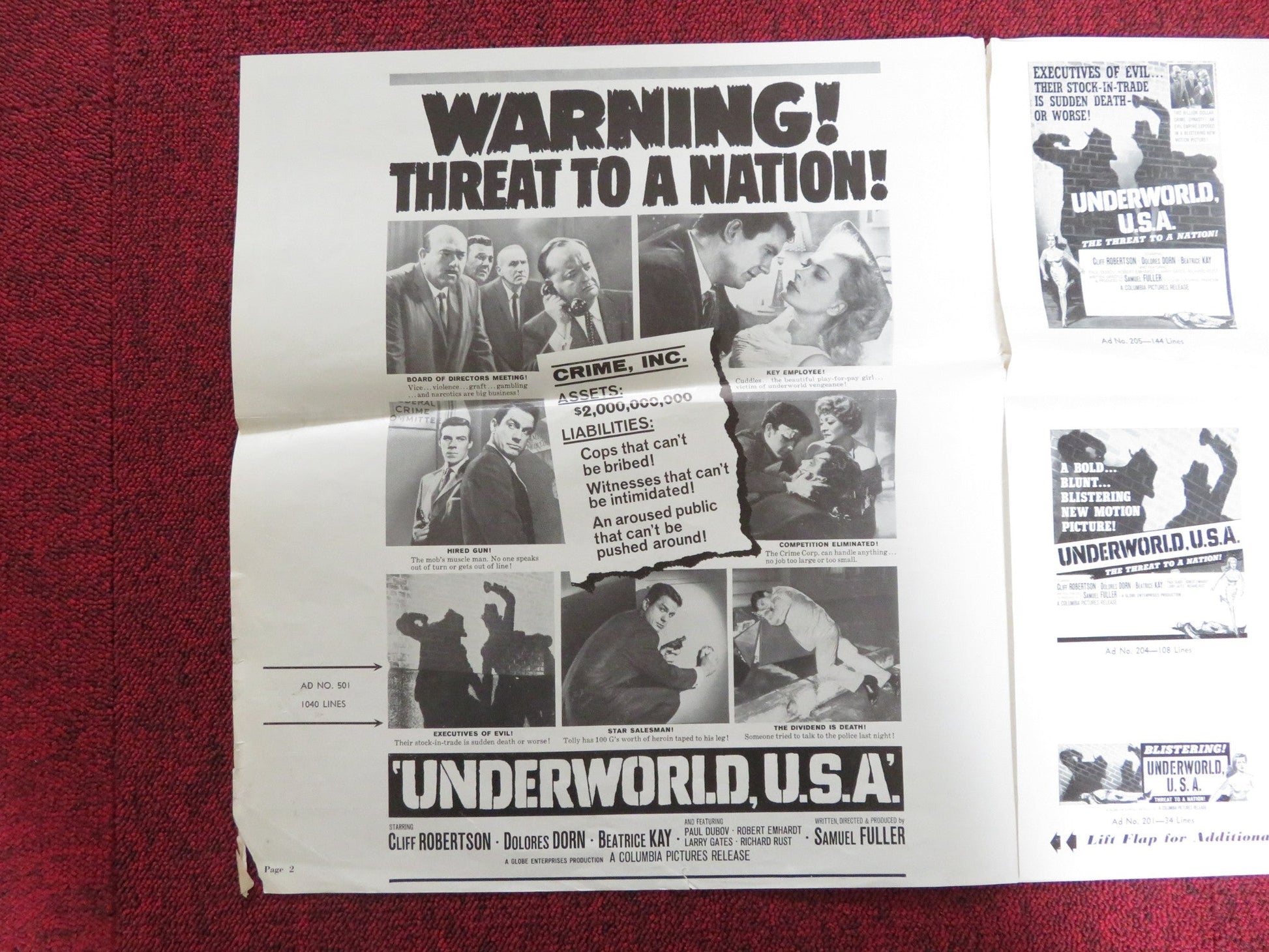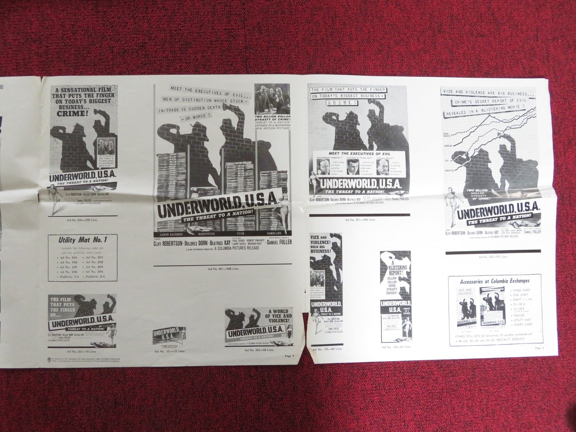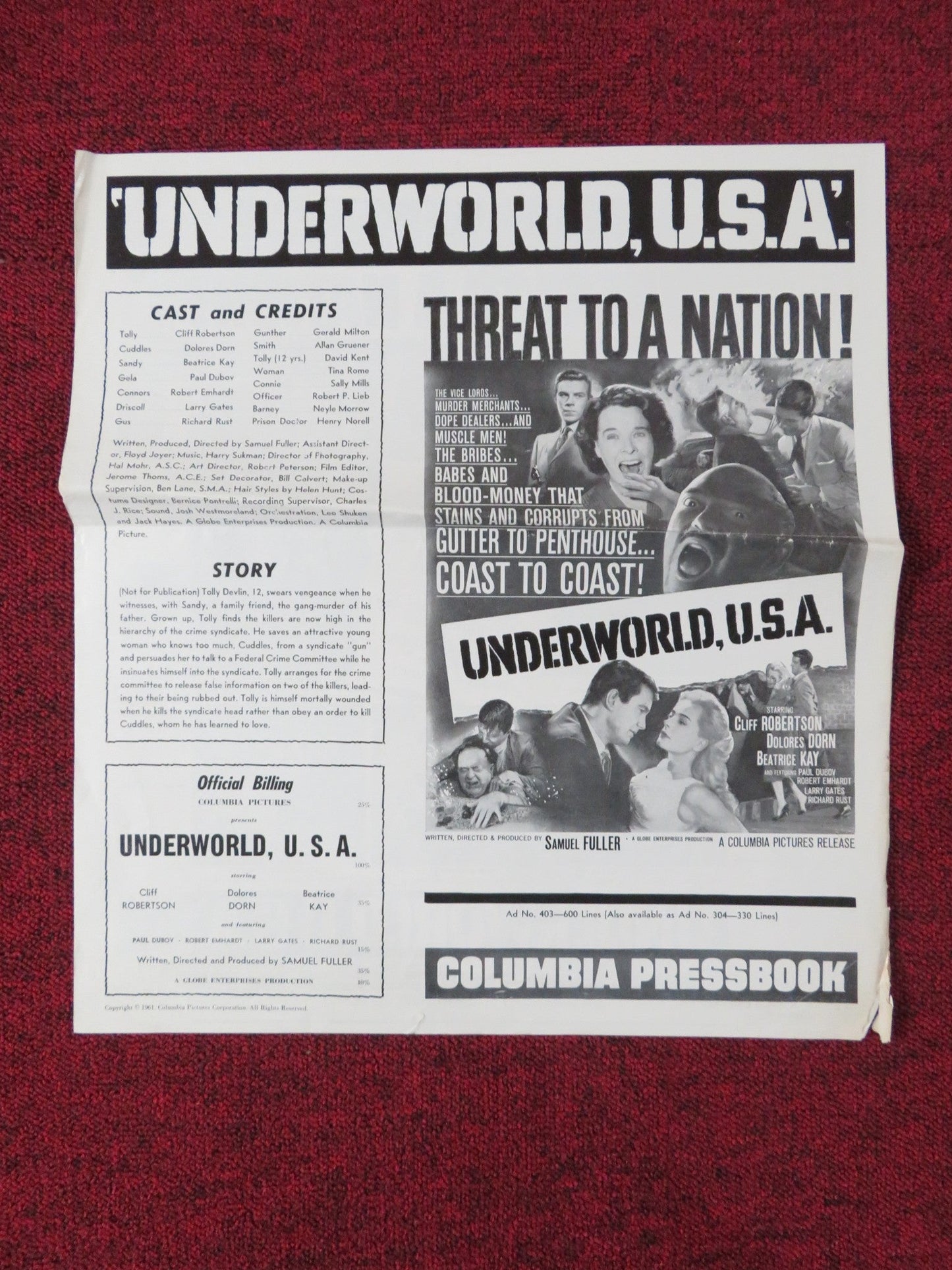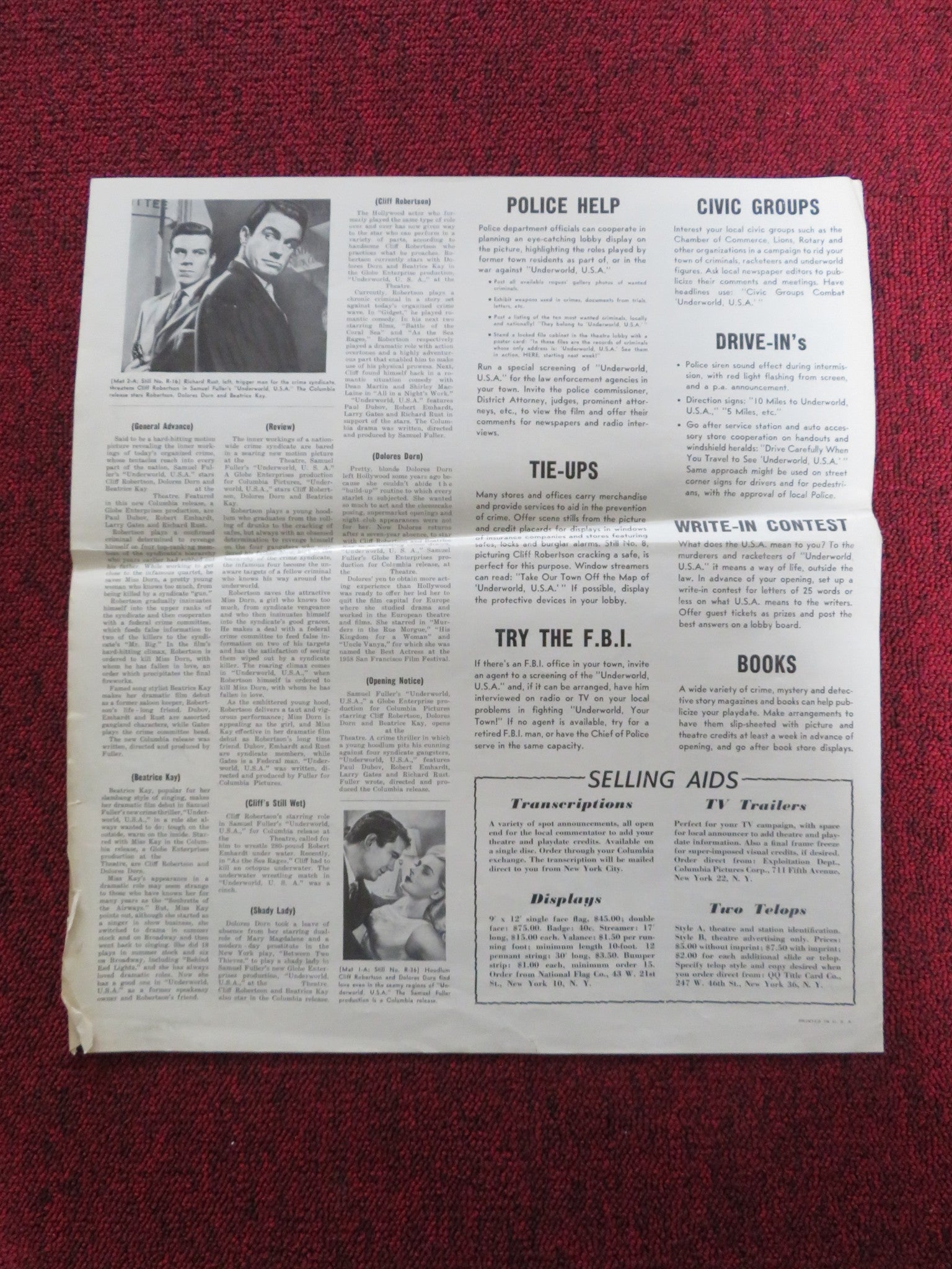 UNDERWORLD U.S.A. UNCUT FOLDED PRESS BOOK CLIFF ROBERTSON DOLORE DORN 1961